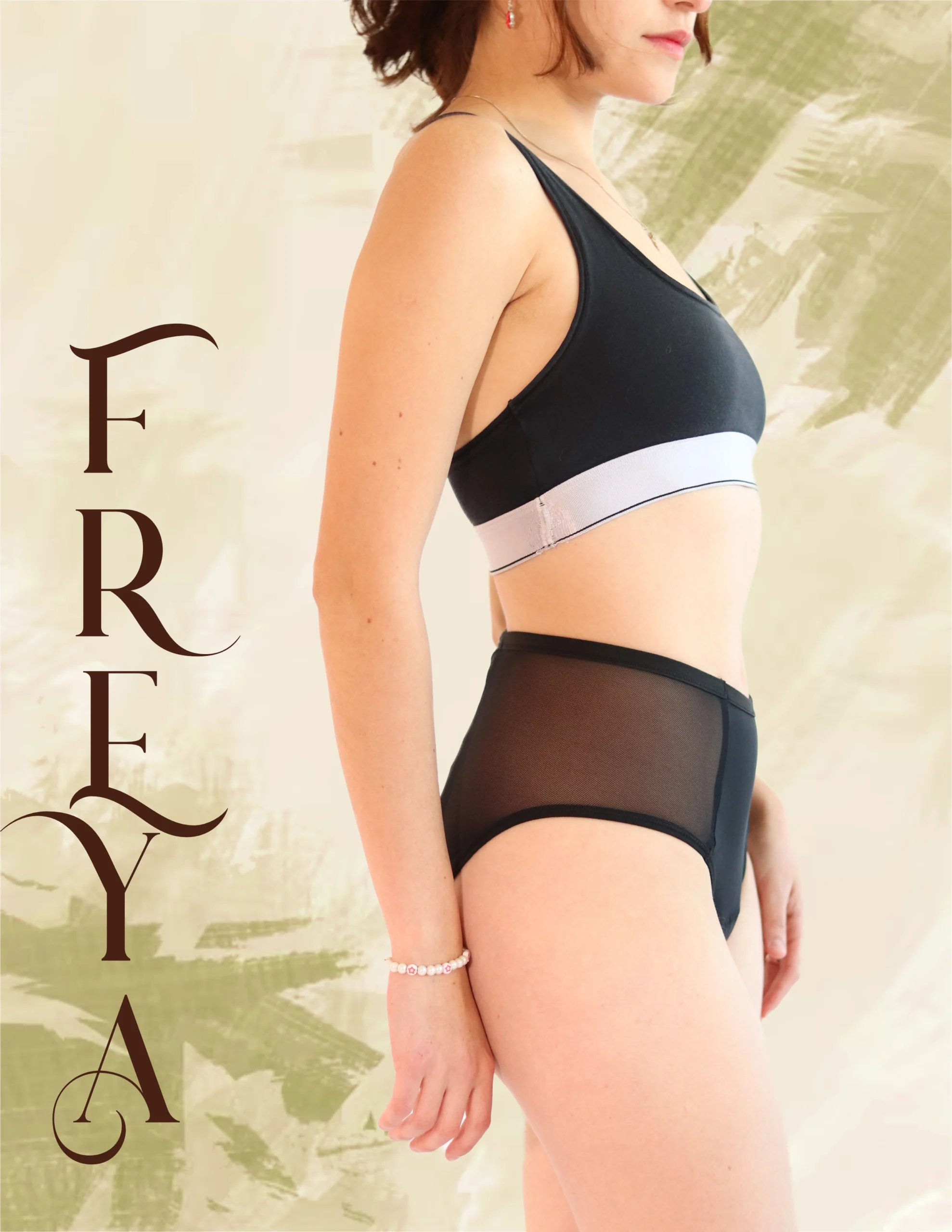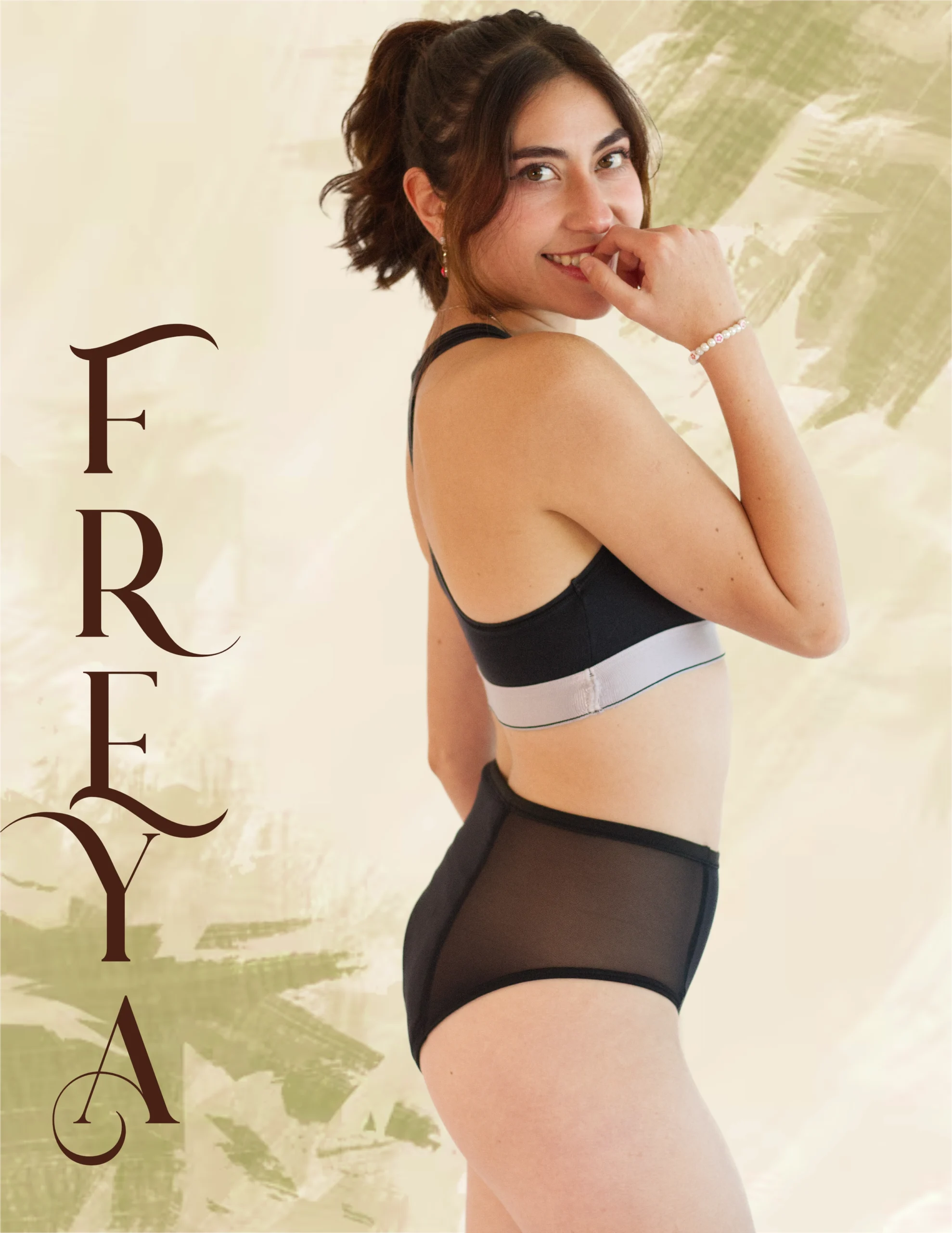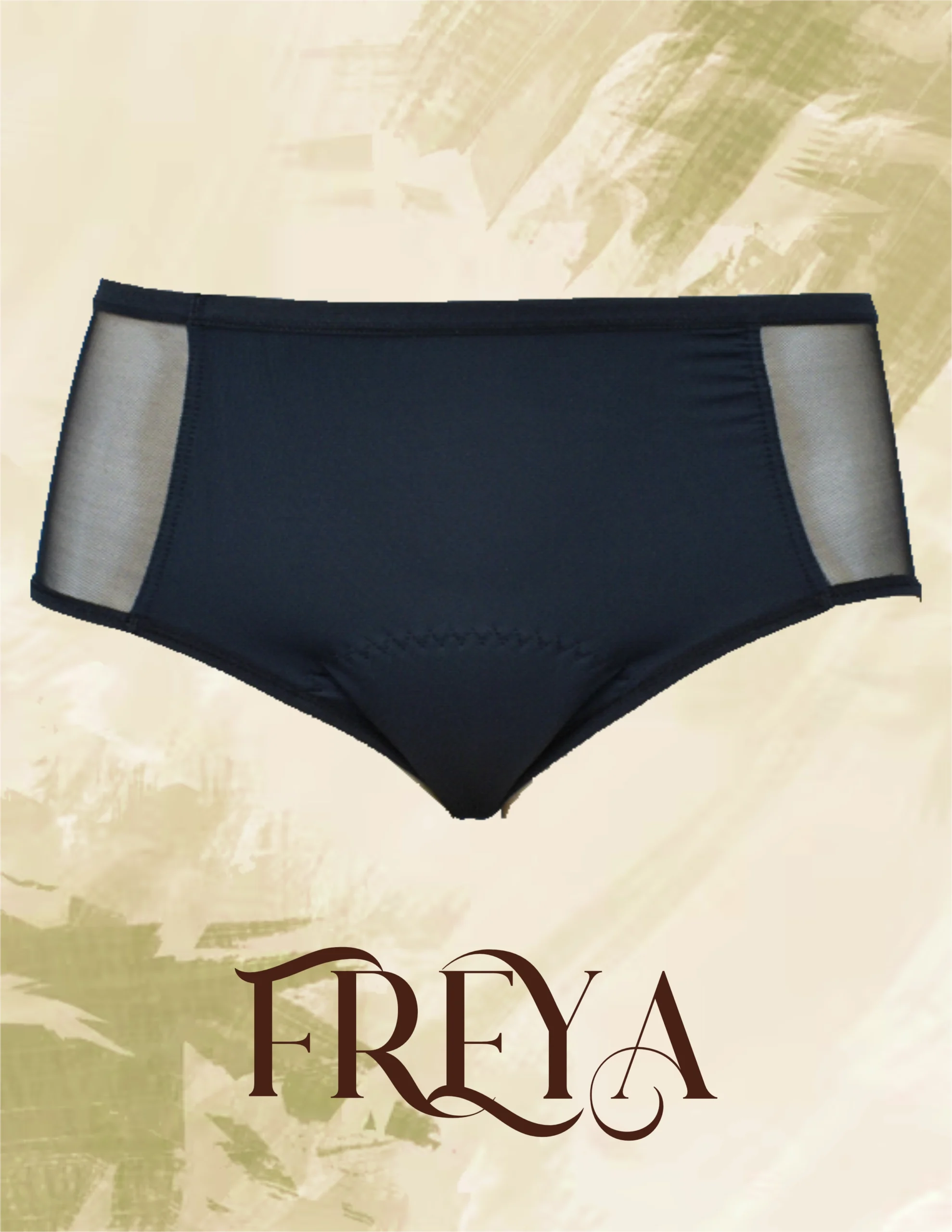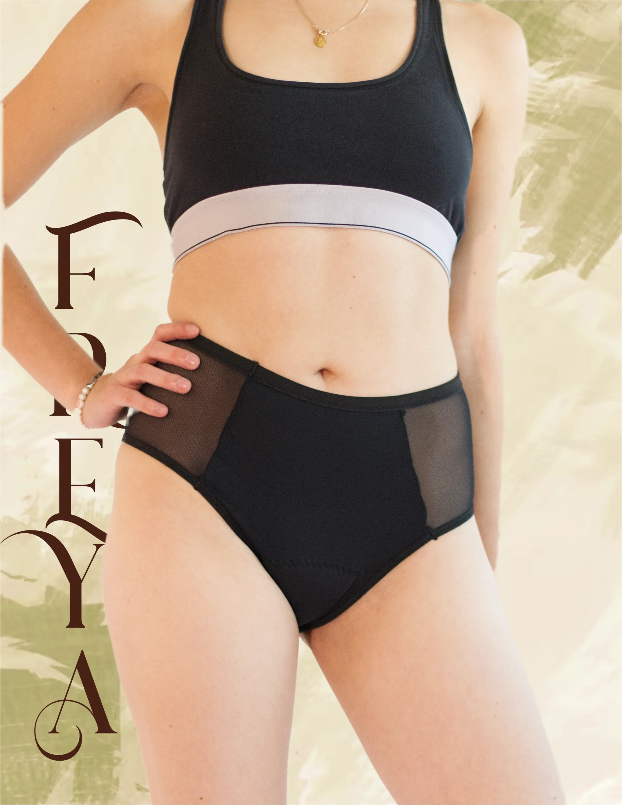 Prenda de diseño clásico con transparencias laterales de cintura alta para flujo abundante.